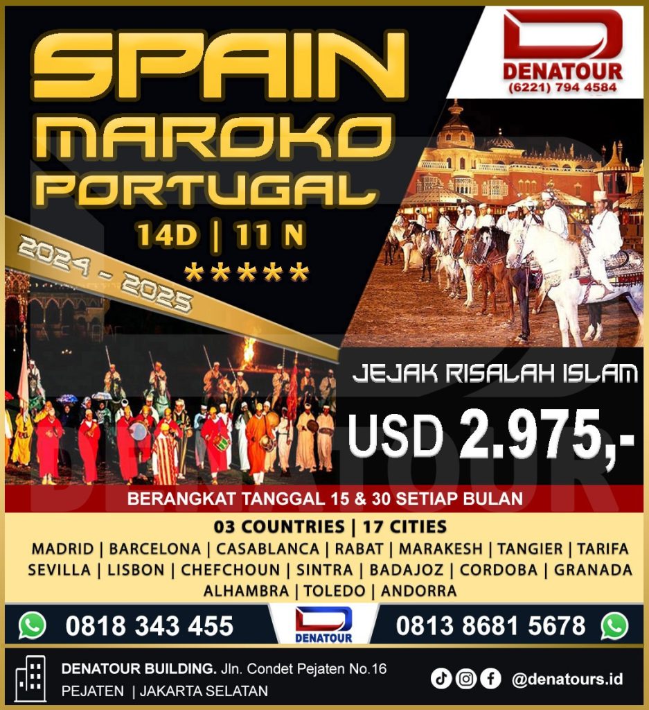 Kebanyakan dari kita tentunya ingin pergi berlibur ke Spanyol Maroko Atau Portugal. DIsana banyak sekali tempat wisata yang sangat baik dikunjungi. Namun, jika kamu merasa khawatir dengan makanan halal atau tidak, Denatour menyediakan Paket Tour Muslim Spanyol Maroko Portugal 2024 untuk kamu. Dengan penawaran ini kamu bisa menikmati liburan kamu Tanpa rasa khawatir akan menu makanan yang disediakan.